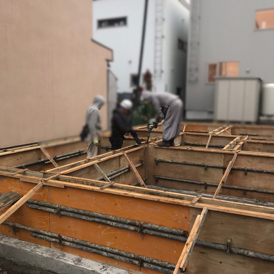 前回、現場状況記事でお伝えした型枠に、基礎のコンクリートを打設しました。