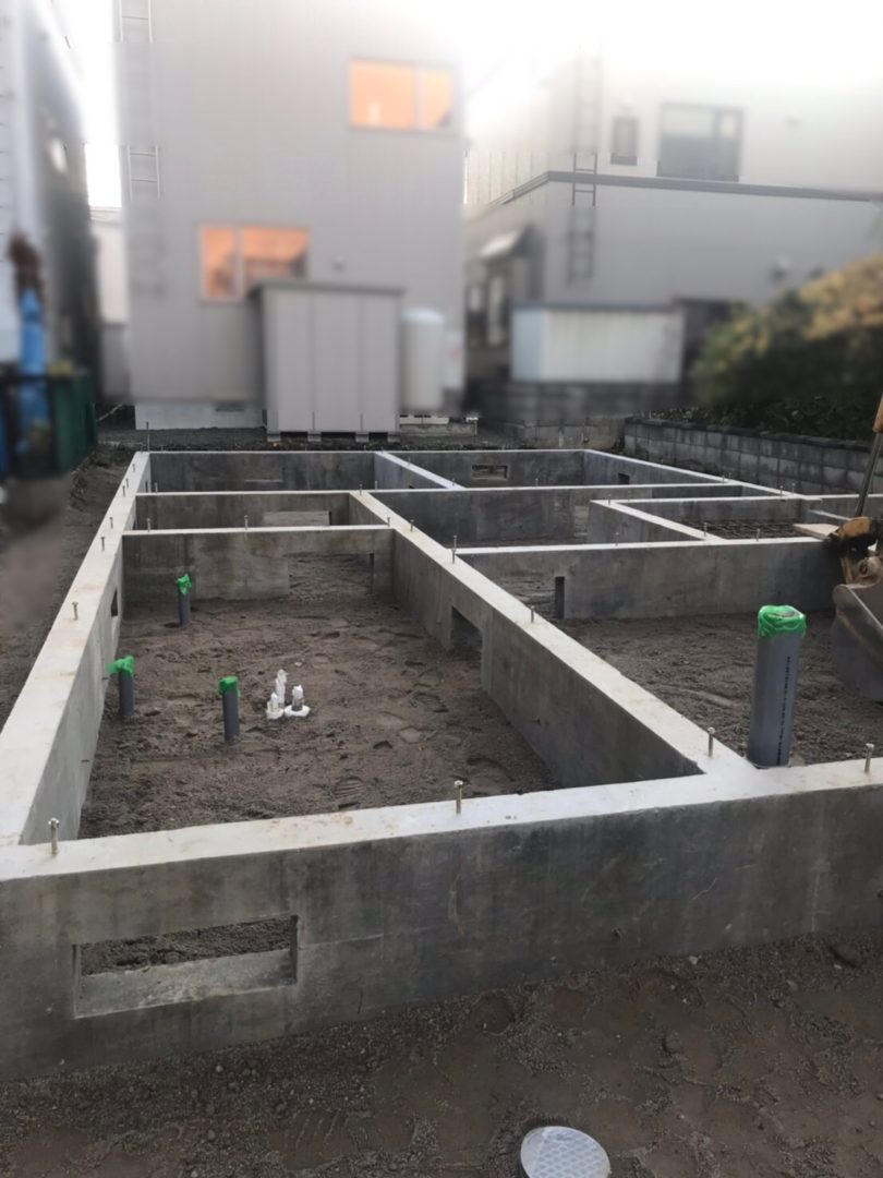 こちらの施工では固めたコンクリートの基礎は、「布基礎」といって、逆Tの字のような形の基礎になっています。